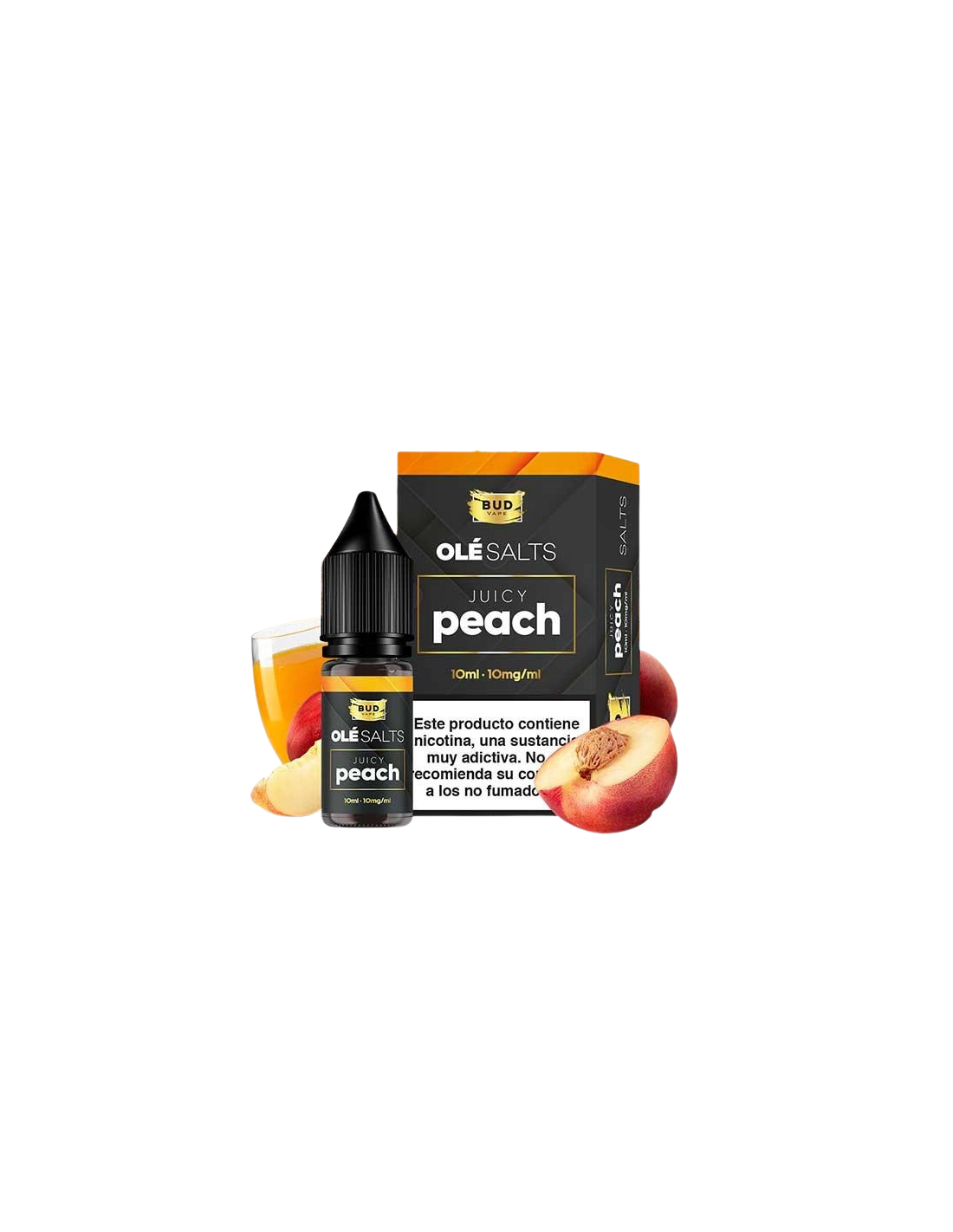 Bud Vape Olé Salts Juicy Peach. Un sabor a jugosos melocotones con un toque de hielo que se derriten en estas sales, para explotar de gusto y sabor en la boca de los vapeadores a los que les encantan los sabores frutales.