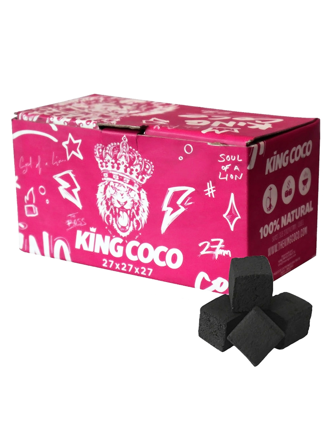 Nuevo formato de 27mm de los carbones naturales de King Coco, en caja de 1Kg. Formato cubo de 27mm x 27mm.