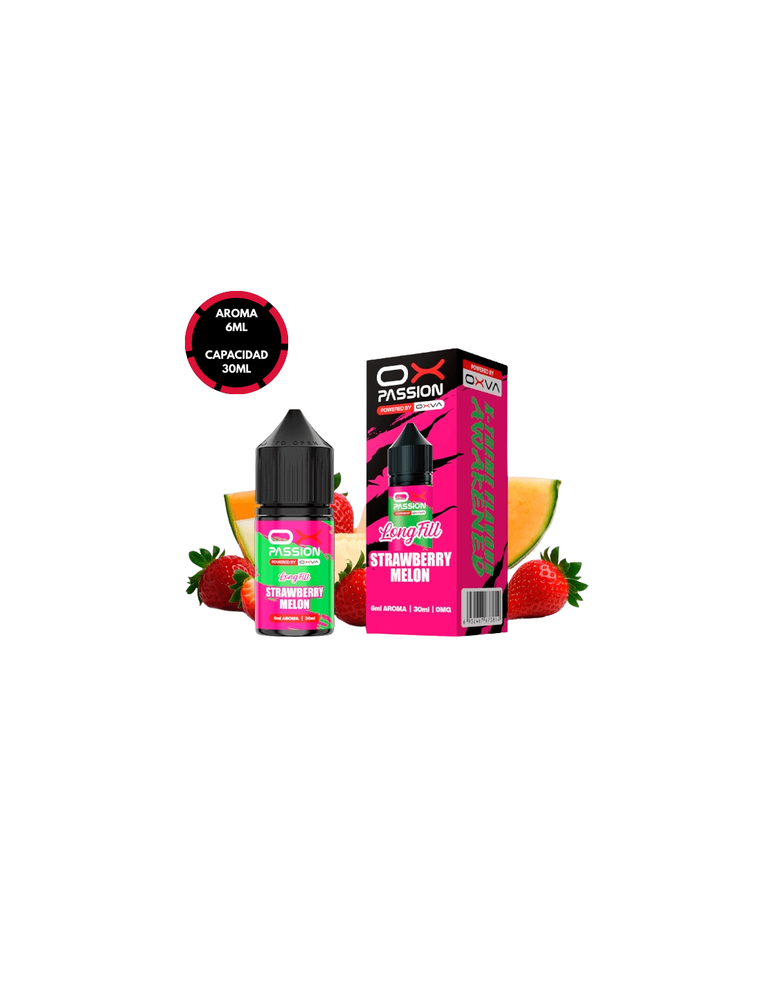Oxva Ox Passion Strawberry Melon Longfill mezcla la dulzura natural de la fresa madura con la frescura ligera del melón, ofreciendo un equilibrio perfecto entre jugosidad y dulzor. Su formato de 6ml de concentrado permite preparar hasta 30ml de e-liquid y es compatible con todas las bases de PG/VG, ideal para los amantes de los sabores frutales suaves y frescos.